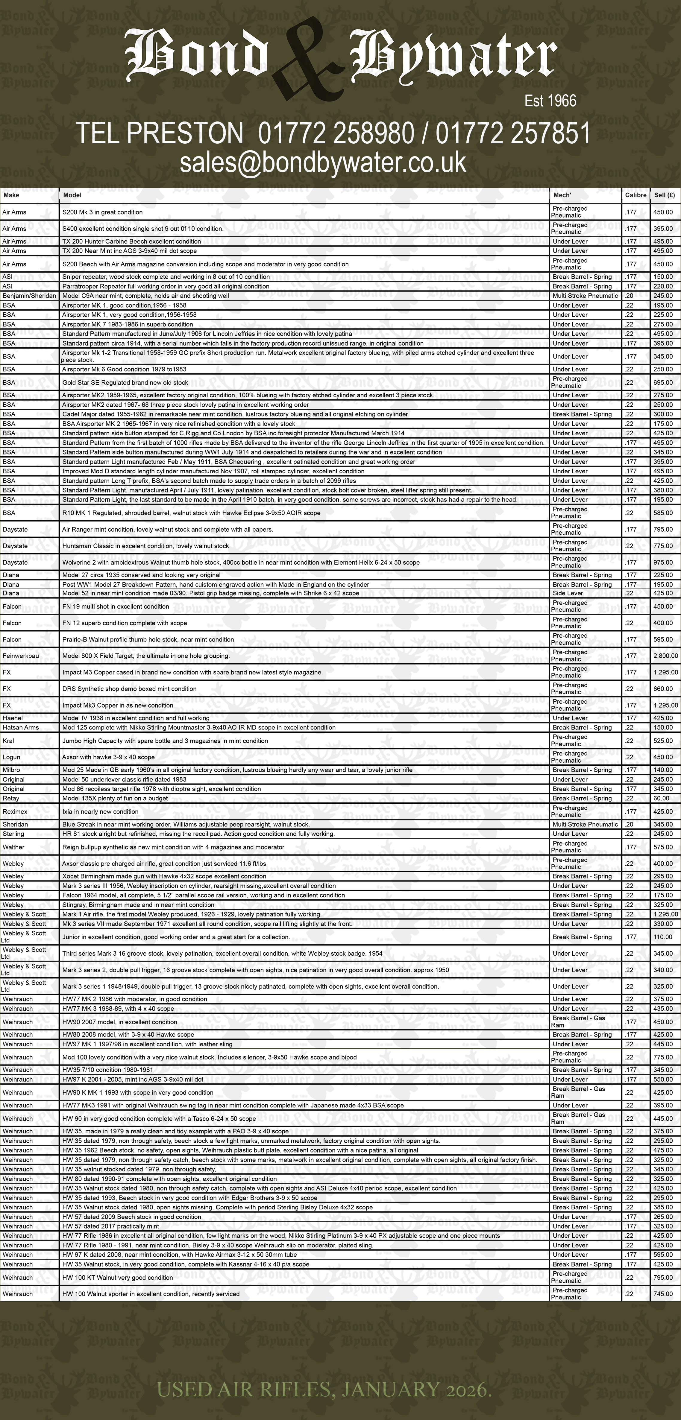 | 16/01/2026 January 2026DOWNLOAD PRICE LIST FOR USED SUB 12 FT/LBS AIR RIFLES If you are looking for a used air rifle, we have many in stock, but we can't get them all advertised on Gun Trader due to time constraints. However we have a list of all the used air rifles we have in stock here which can be downloaded. The range shown covers modern, collectible and vintage makes. It is advisable to either ring us or email to make sure any item you may be interested in is still available. Click here for price list Click here for a different format price list if you can't open the first one IF THERE IS ANYTHING OF INTEREST PLEASE GIVE US A CALL. Read More > | ![]() |