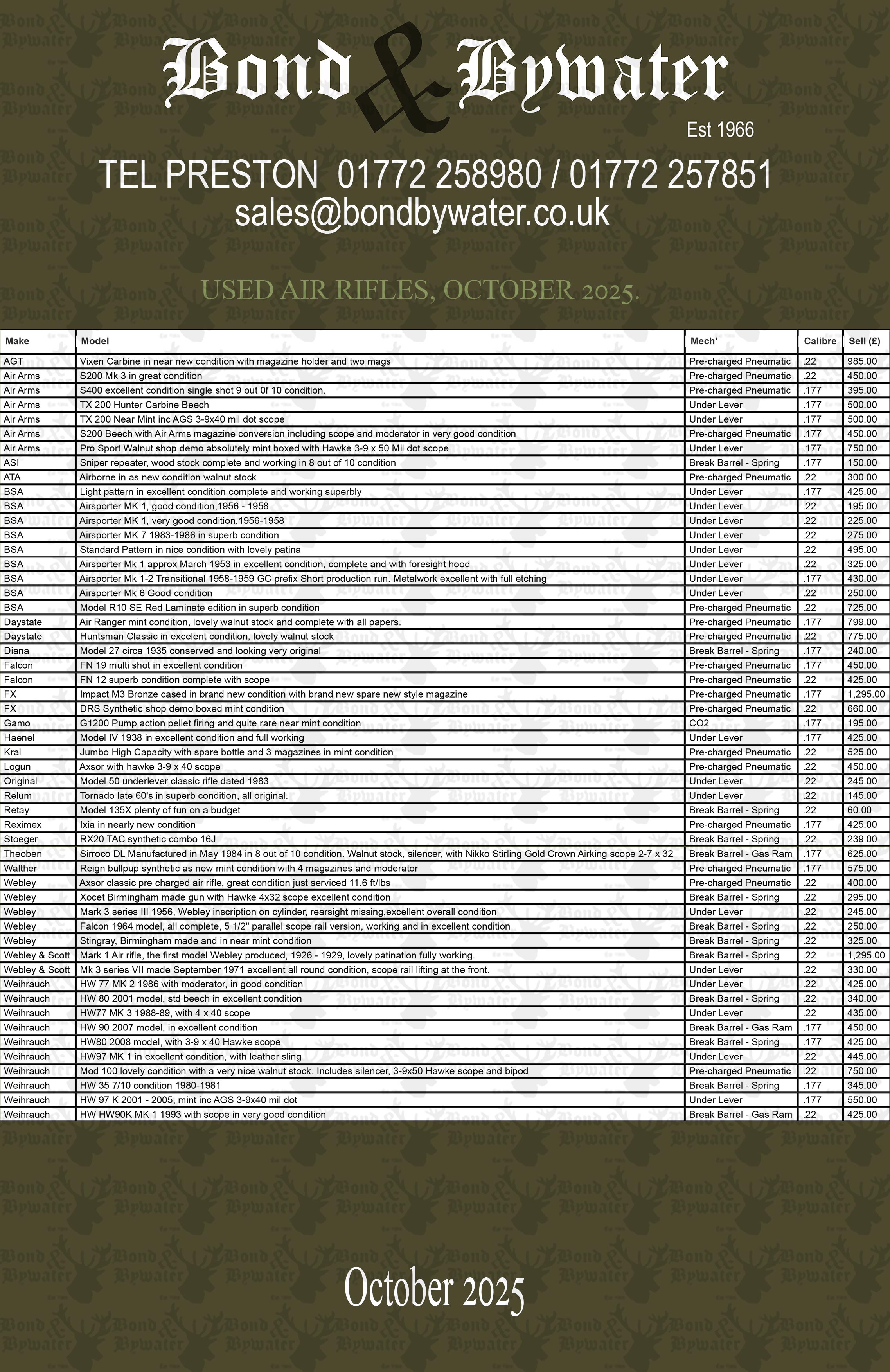 18/10/2025 October 2025Price list for second hand Section One rifles and air rifles Here is our Second hand Section one rifle price list for downloading. Click here for a section one rifle price list Click here for a different format price list if you can't open the first one IF THERE IS ANYTHING OF INTEREST PLEASE GIVE US A CALL. Read More > | ![]() |
