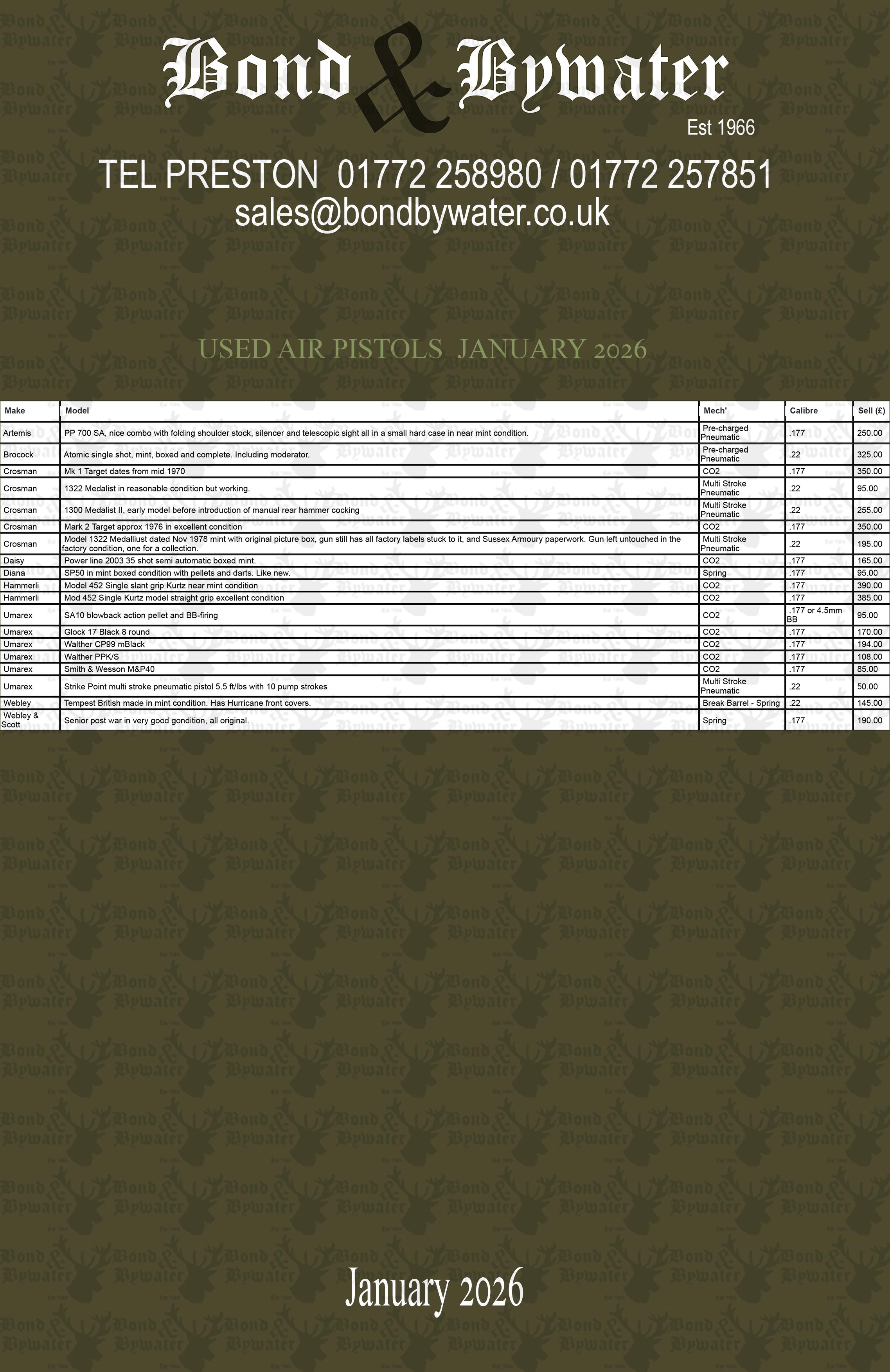 | 17/01/2026 January 2026 DOWNLOAD PRICE LIST FOR USED AIR PISTOLS If you are looking for a used air pistol, we have many in stock, but we can't get them all advertised on Gun Trader due to time constraints. However the next best thing is the list which we have put a link to for a document with the current second hand air rifles we have in stock. Click here for price list Click here for a different format price list if you can't open the first one IF THERE IS ANYTHING OF INTEREST PLEASE GIVE US A CALL. Read More > | ![]() |