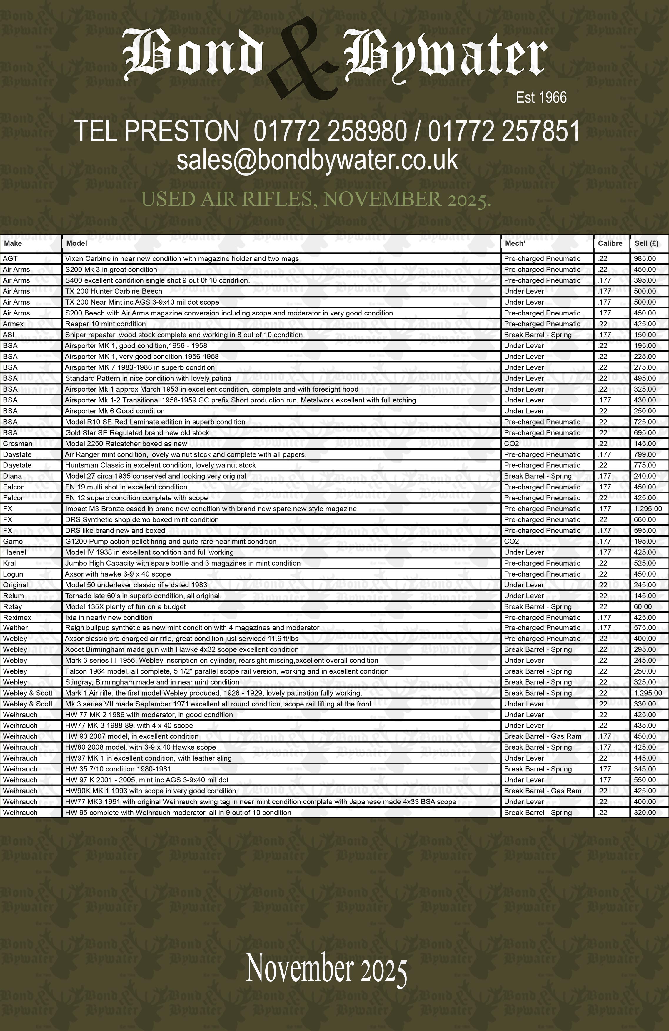 If you are looking for a used air rifle, we have many in stock, but we can't get them all advertised on Gun Trader due to time constraints. However the next best thing is the list which we have put a link to for a document with the current second hand air rifles we have in stock.
