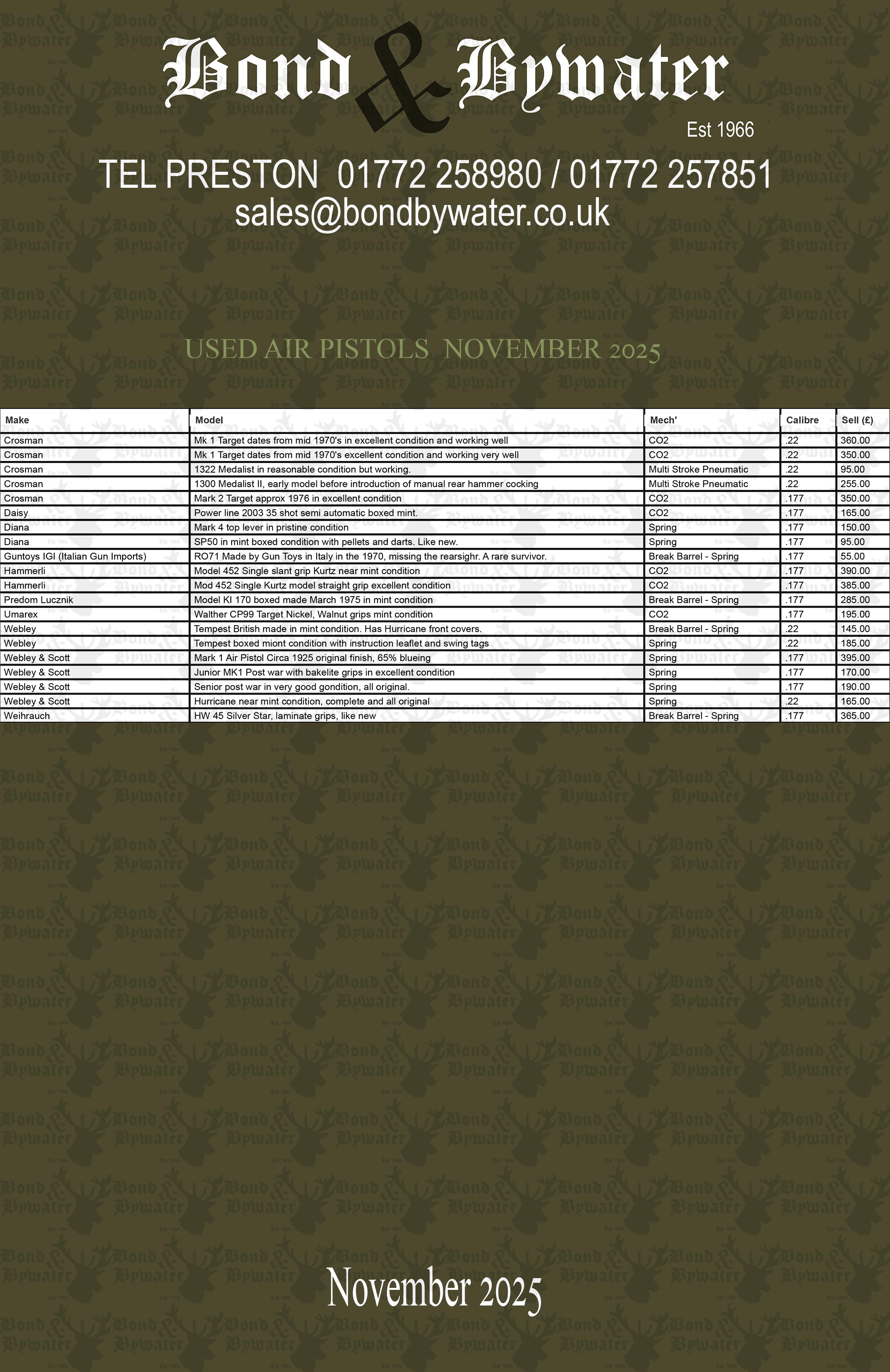 If you are looking for a used air pistol, we have many in stock, but we can't get them all advertised on Gun Trader due to time constraints. However the next best thing is the list which we have put a link to for a document with the current second hand air rifles we have in stock.