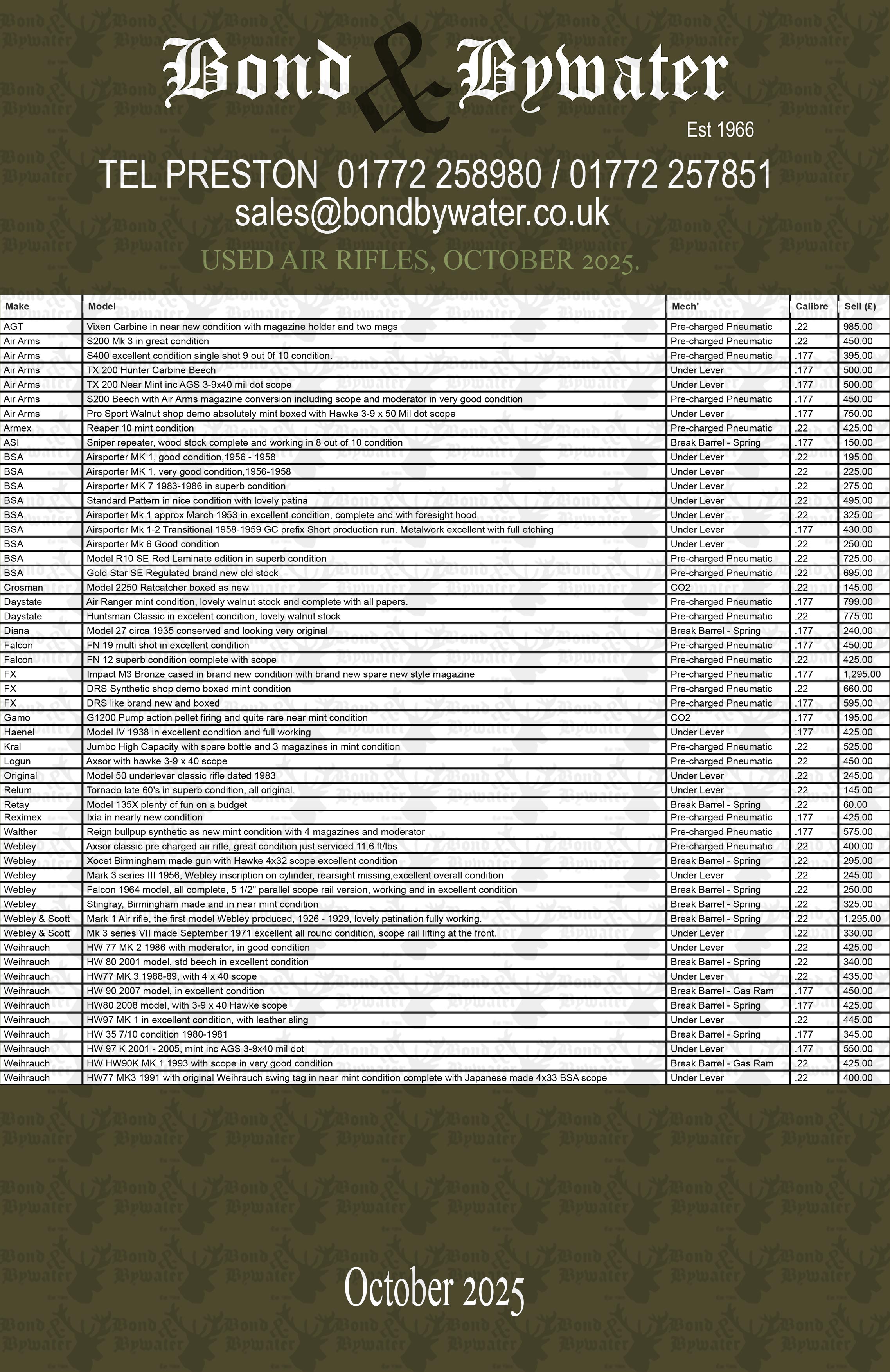 | 23/10/2025 October 2025Price list for second hand Section One rifles and air rifles Here is our Second hand Section one rifle price list for downloading. Click here for a section one rifle price list Click here for a different format price list if you can't open the first one IF THERE IS ANYTHING OF INTEREST PLEASE GIVE US A CALL. Read More > | ![]() |