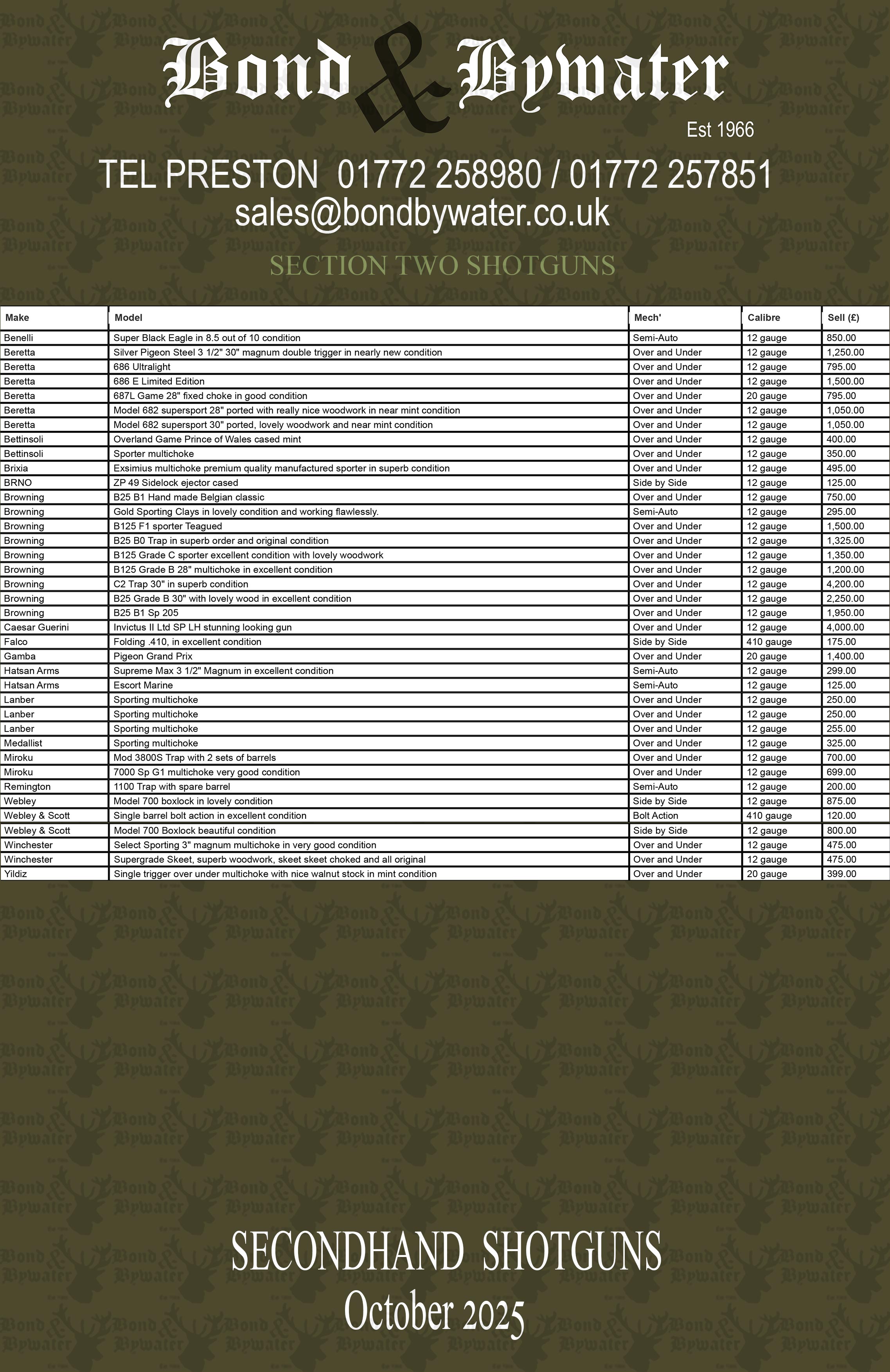 | 23/10/2025 October 2025Price list for second hand section Two shotguns Here is our Second hand shotguns price list for downloading. Click here for second hand shotguns price list Click here for a different format price list if you can't open the first one IF THERE IS ANYTHING OF INTEREST PLEASE GIVE US A CALL. Read More > | ![]() |