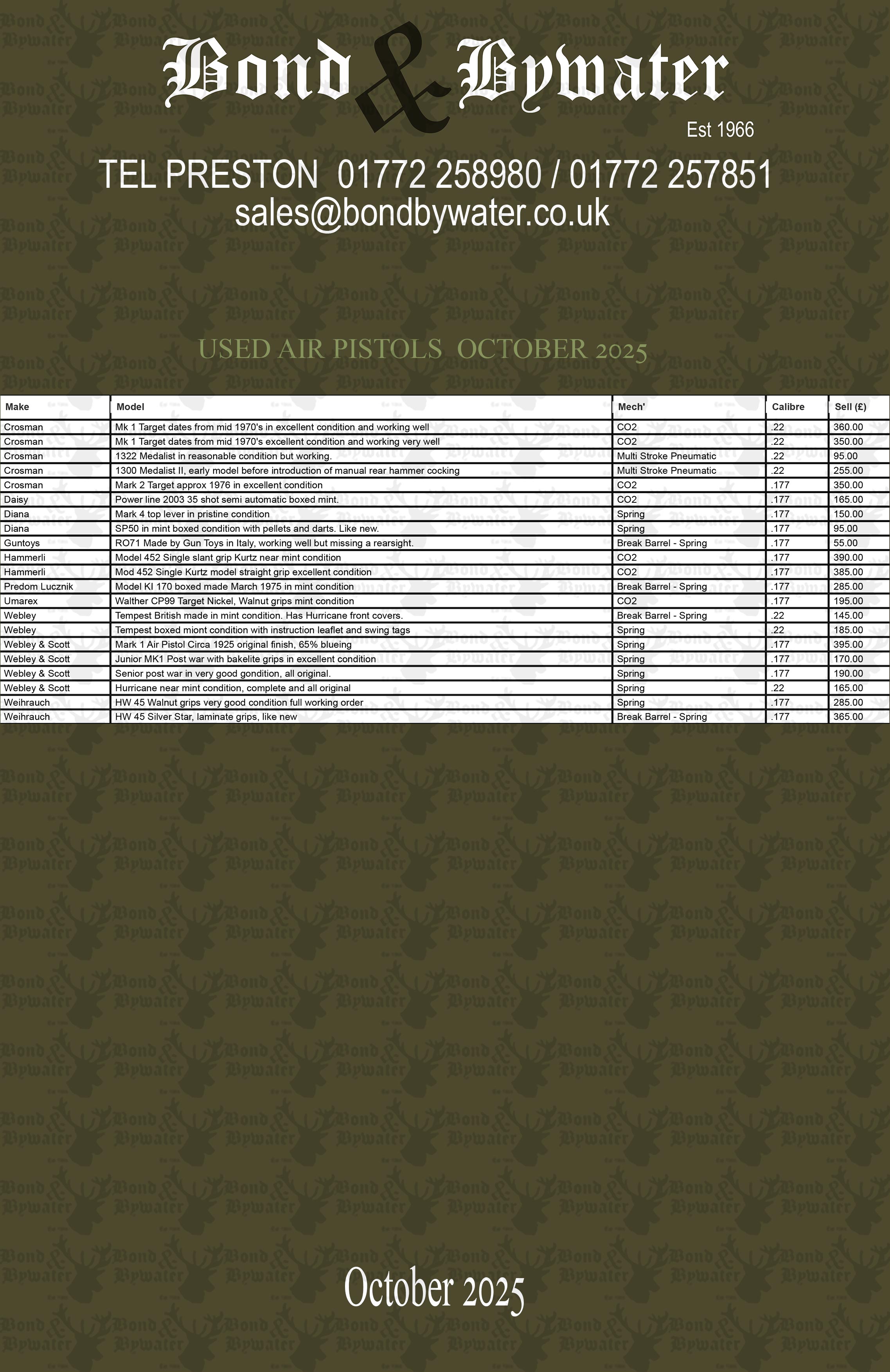 | 23/10/2025 October 2025 Price list for second hand air pistols If you are looking for a used air pistol, we have many in stock, but we can't get them all advertised on Gun Trader due to time constraints. However the next best thing is the list which we have put a link to for a document with the current second hand air rifles we have in stock. Click here for price list Click here for a different format price list if you can't open the first one IF THERE IS ANYTHING OF INTEREST PLEASE GIVE US A CALL. Read More > | ![]() |
