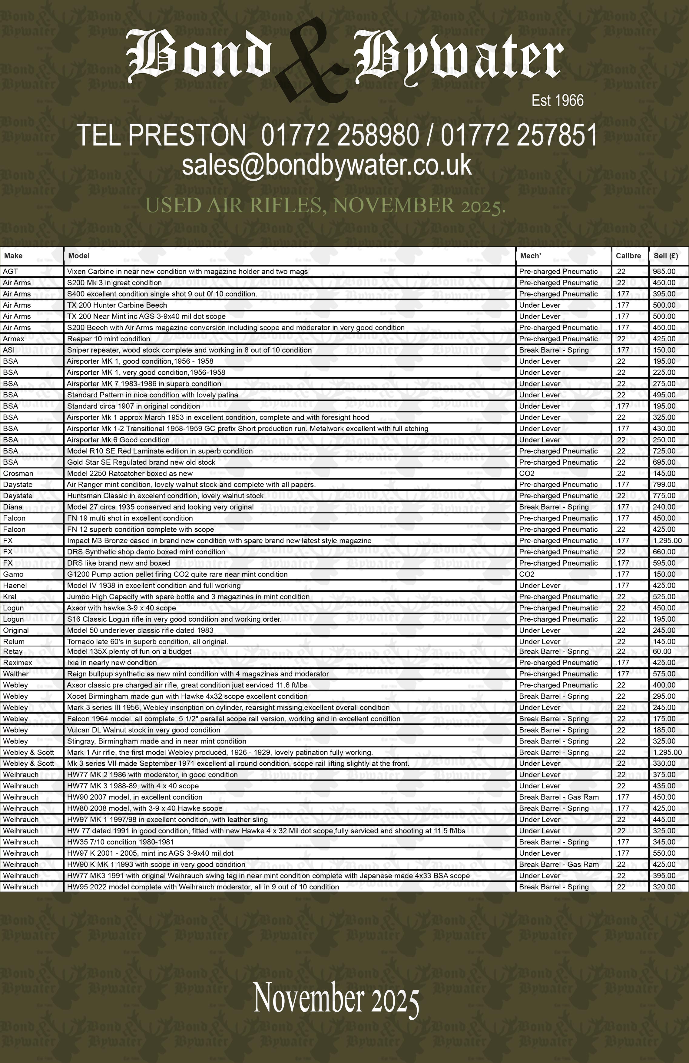 | 14/11/2025 November 2025Price list for second hand Section One rifles and air rifles Here is our Second hand Section one rifle price list for downloading. Click here for a section one rifle price list Click here for a different format price list if you can't open the first one IF THERE IS ANYTHING OF INTEREST PLEASE GIVE US A CALL. Read More > | ![]() |
