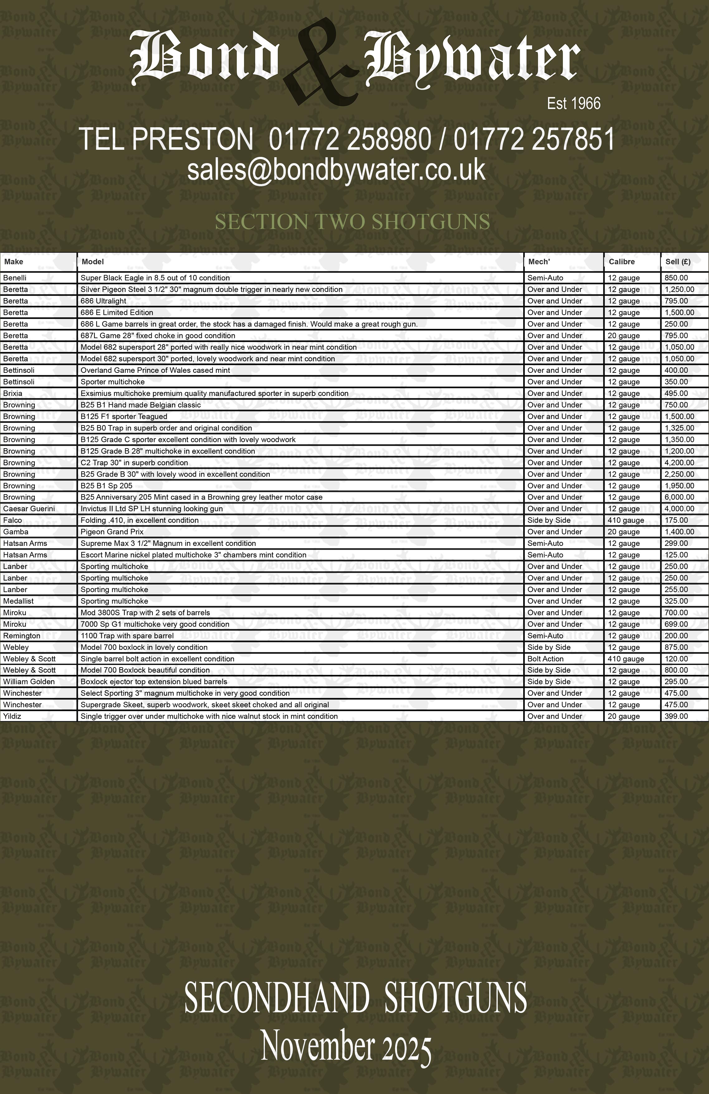 | 14/11/2025 November 2025Price list for second hand section Two shotguns Here is our Second hand shotguns price list for downloading. Click here for second hand shotguns price list Click here for a different format price list if you can't open the first one IF THERE IS ANYTHING OF INTEREST PLEASE GIVE US A CALL. Read More > | ![]() |