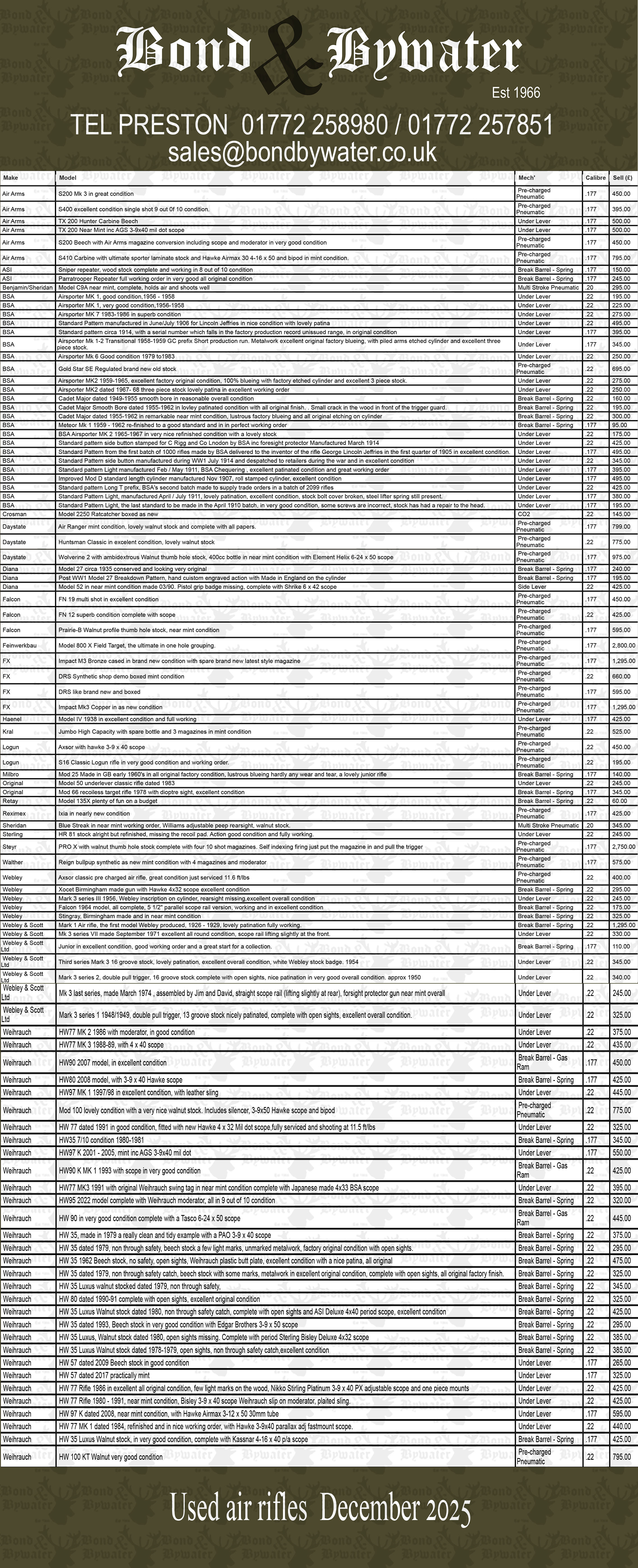 | 13/12/2025 December 2025DOWNLOAD PRICE LIST FOR USED SUB 12 FT/LBS AIR RIFLES If you are looking for a used air rifle, we have many in stock, but we can't get them all advertised on Gun Trader due to time constraints. However we have a list of all the used air rifles we have in stock here which can be downloaded. The range shown covers modern, collectible and vintage makes. It is advisable to either ring us or email to make sure any item you may be interested in is still available. Click here for price list Click here for a different format price list if you can't open the first one IF THERE IS ANYTHING OF INTEREST PLEASE GIVE US A CALL. Read More > | ![]() |