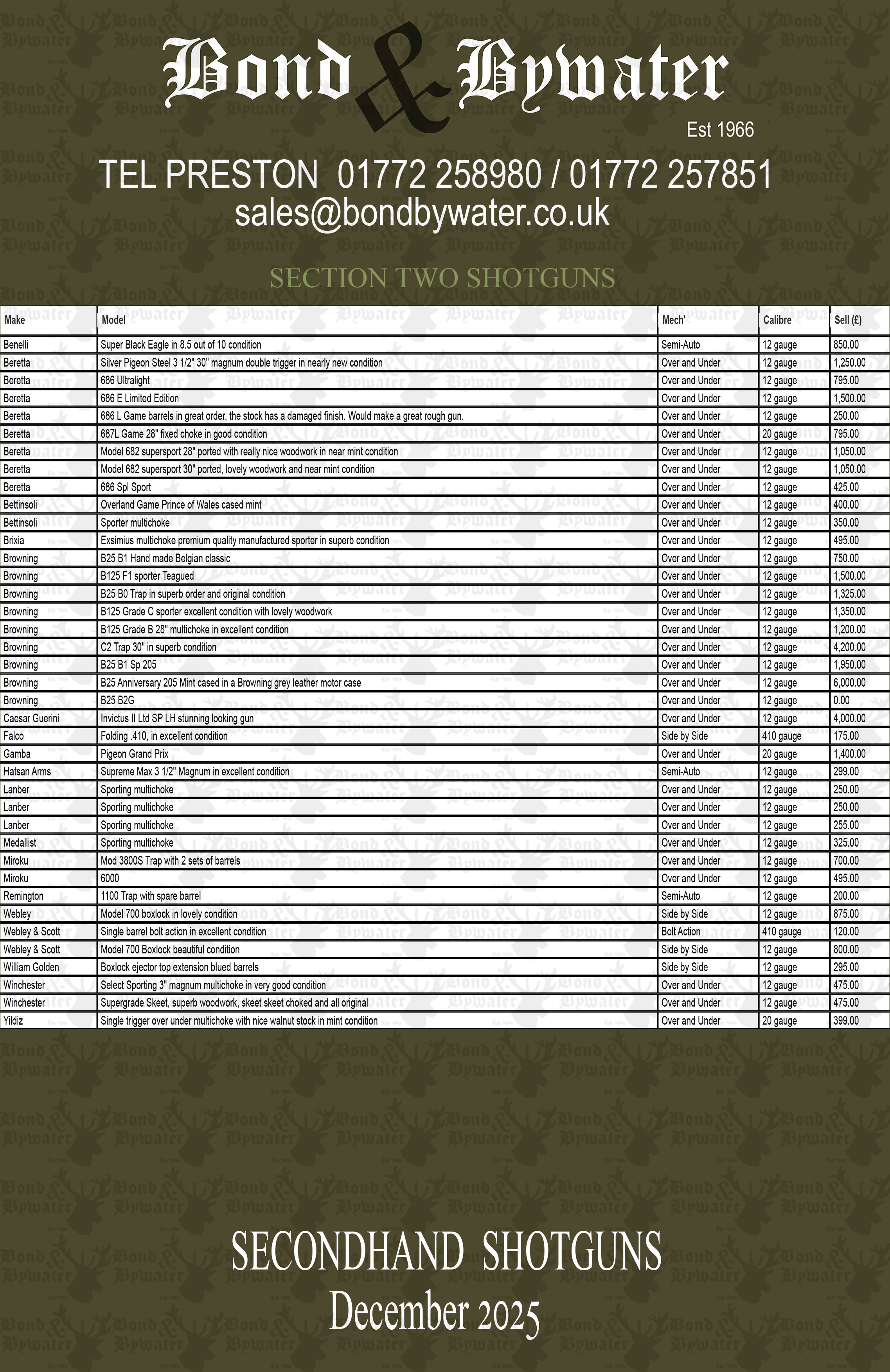 | 13/12/2025 December 2025DOWNLOAD PRICE LIST FOR USED SECOND HAND SECTION 2 SHOTGUNS Here is our Second hand shotguns price list for downloading. Click here for second hand shotguns price list Click here for a different format price list if you can't open the first one IF THERE IS ANYTHING OF INTEREST PLEASE GIVE US A CALL. Read More > | ![]() |